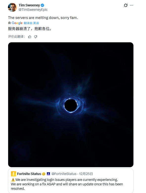 大约三小时后,Tim Sweeney 再次更新消息,表示服务器已恢复正常,同时向玩家送上圣诞祝福。