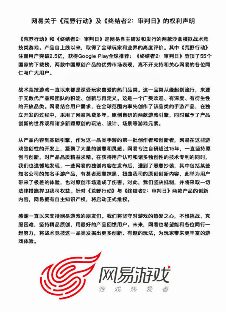 对于游戏方面,网易称,《荒野行动》和《终结者2:审判日》商业化进程顺利,主要通过销售游戏内虚拟产品实现其变现。其中《荒野行动》注册用户突破2.5亿,获得Google Play全球推荐;《终结者2:审判日》登顶了55个国家的下载榜。值得一提的是,网易在4月7日发布了一份关于《荒野行动》和《终结者2:审判日》的维权声明,强调:“一些网易的独创内容在发布后,遭到了恶意抄袭,其中包括某些知名公司的知名手游产品,有甚者恶意抹黑、扭曲我司的原创创新内容,此举为用户带来了极差的体验,也对原创市场造成了伤害,对此,我们坚决,并将采取一切法律措施捍卫我司权益。针对《荒野行动》与《终结者2:审判日》两款产品的创新内容,网易拥有自主知识产权,将启动正式维权。”然而,据环球网财经了解,4月5日,也就是网易发布维权申明的前两天,《绝地求生》公司PUBG正式对《终结者2》、《荒野行动》两款吃鸡手游的开发商——网易,发起了版权诉讼。
