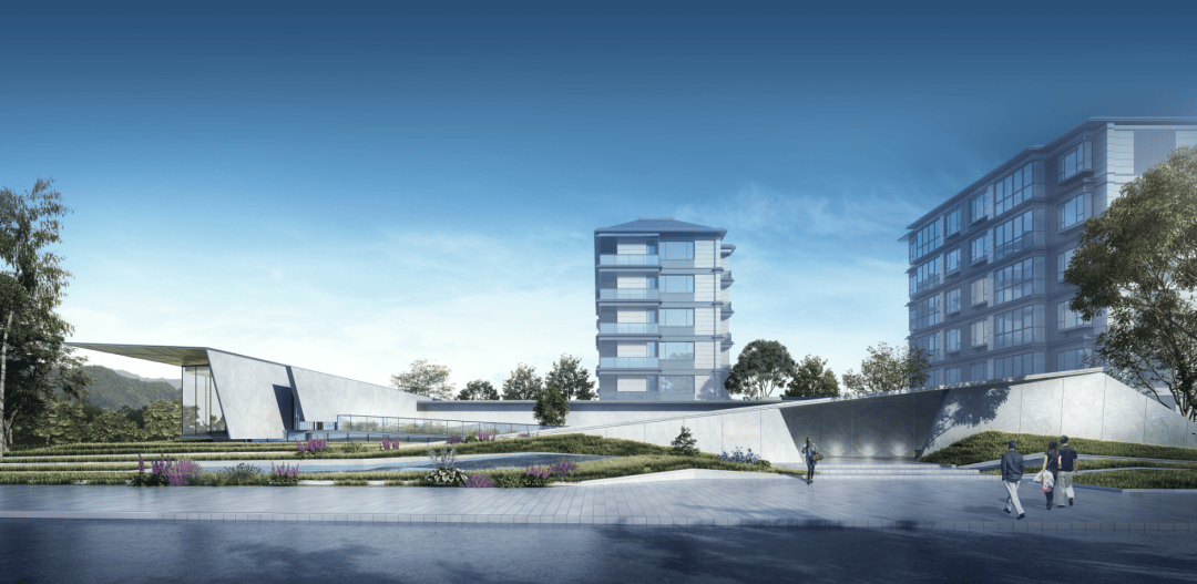 建筑上,秉承“现代的轻盈,传统的厚重”理念,融合东西方建筑精髓创新打造,项目采用铝板、 石材、中式挑檐等建筑材质与设计手法,精致考究建筑风格,于群山之中呈现一座自然融合的现代典雅建筑群。