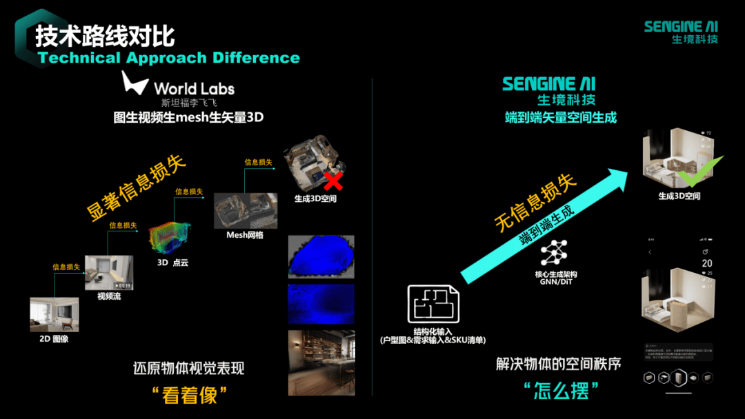 我们正在做的事情与李飞飞的技术方向比较贴近,但属于完全不同的范式。她是从纯视觉的维度来理解空间,方向是文生图、图转空间。尽管可通过文字方式做修改,但由于链路太长,本质上属于“拿大炮打蚊子”。另外就是,视觉表皮生成的技术路线擅长换风格,但在其它任务是结构性地能力缺失。
