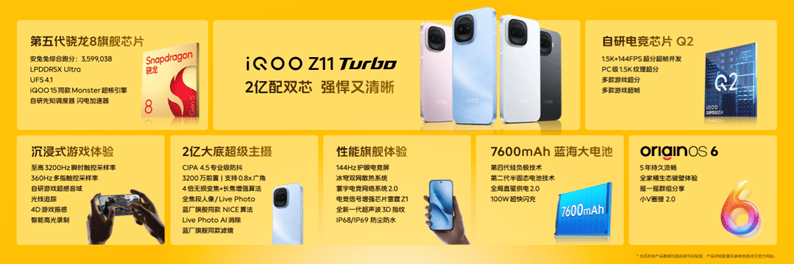 iQOO Z11 Turbo搭载第五代骁龙8旗舰芯与自研电竞芯片Q2双芯组合,配备2亿像素主摄、7600mAh超薄蓝海大电池、金属中框、玻璃/玻纤后盖、IP68/69防尘防水、超声波3D指纹等旗舰配置,首次在Z系列中实现旗舰级外观质感、顶级游戏性能、超清影像系统与超长续航能力的全面融合。首销优惠价2399元起,面向“跨次元玩家”,打造该价位段集强性能、好影像、高质感于一体的全能型中屏产品新标杆。