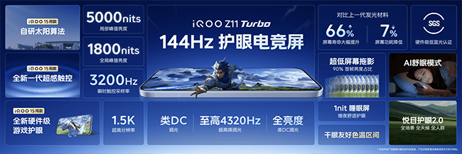 iQOO Z11 Turbo配备6.59英寸1.5K 144Hz护眼电竞屏,支持类DC调光、至高4320Hz超高频调光、全亮度类DC调光三重护眼方案,通过SGS硬件级低蓝光与低频闪认证,实现全天候、全人群、全场景护眼。