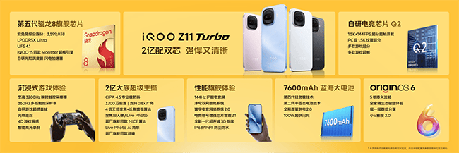 iQOO Z11 Turbo搭载第五代骁龙8旗舰芯与自研电竞芯片Q2双芯组合,配备2亿像素主摄、7600mAh超薄蓝海大电池、金属中框、玻璃/玻纤后盖、IP68/69防尘防水、超声波3D指纹等旗舰配置,首次在Z系列中实现旗舰级外观质感、顶级游戏性能、超清影像系统与超长续航能力的全面融合。首销优惠价2399元起,面向“跨次元玩家”,打造该价位段集强性能、好影像、高质感于一体的全能型中屏产品新标杆。