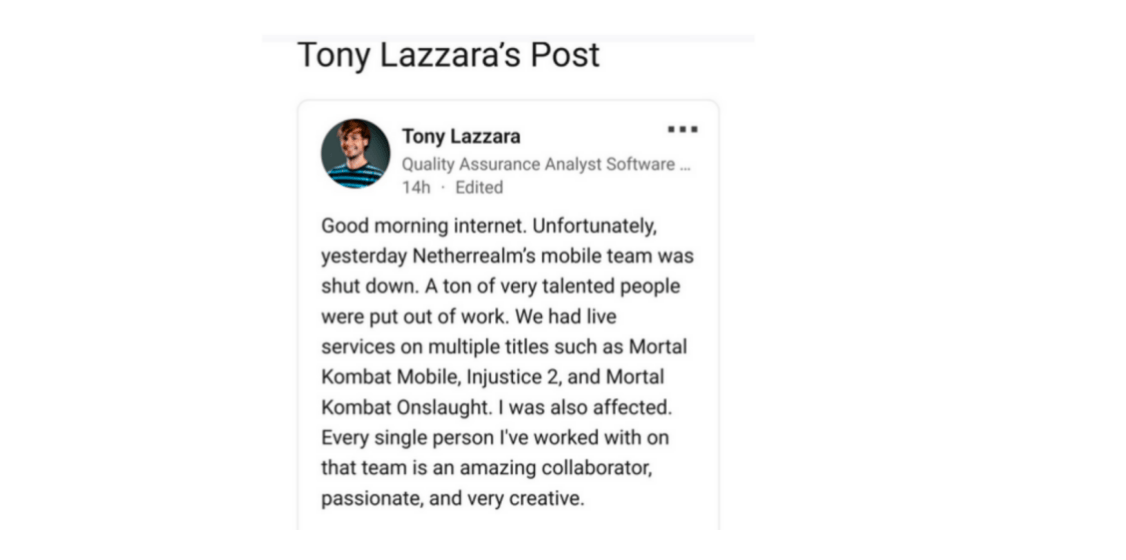 这一消息最先被论坛ResetEra的用户Turnscr3w发现并广泛传播开来。据领英上的员工发布的帖子显示,裁员波及范围广泛,许多员工将不得不面对失业的现实。其中,QA分析师Tony Lazzara在他的帖子中写道:“早上好,互联网。不幸的是,昨天NetherRealm的移动团队被关闭了。大量很有才华的人失业了。”另一位动画师Elizabeth Ramirez也在社交媒体上分享了她的感受:“在NetherRealm Studios工作了约10年后,我被宣布解雇,这让我很受伤。”