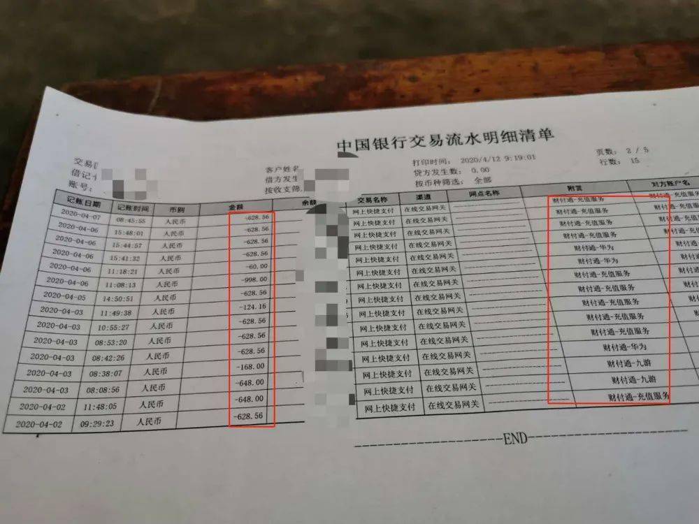 在杨正林提供的银行交易流水明细清单上,记者看到,4月2日至11日中有7天,出现通过手机进行的“网上快捷支付”交易,共31次。单次交易费用从最低6元到最高998元不等,“对方账户名”显示为“财付通-充值服务”、“财付通-华为”或“财付通-九游”。充值间隔最短的不到一分钟,如4月11日第三次充值与第四次充值仅间隔36秒。
